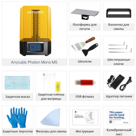 Комплект поставки | 3D принтер Anycubic Photon Mono M5, ванночка для фотополимера, печатающая платформа, скребок, USB - накопитель, адаптер питания, бумага для выравнивания, набор инструментов, руководство пользователя, перчатки, воронка, маск, комплект защитной пленки для ЖК экрана |