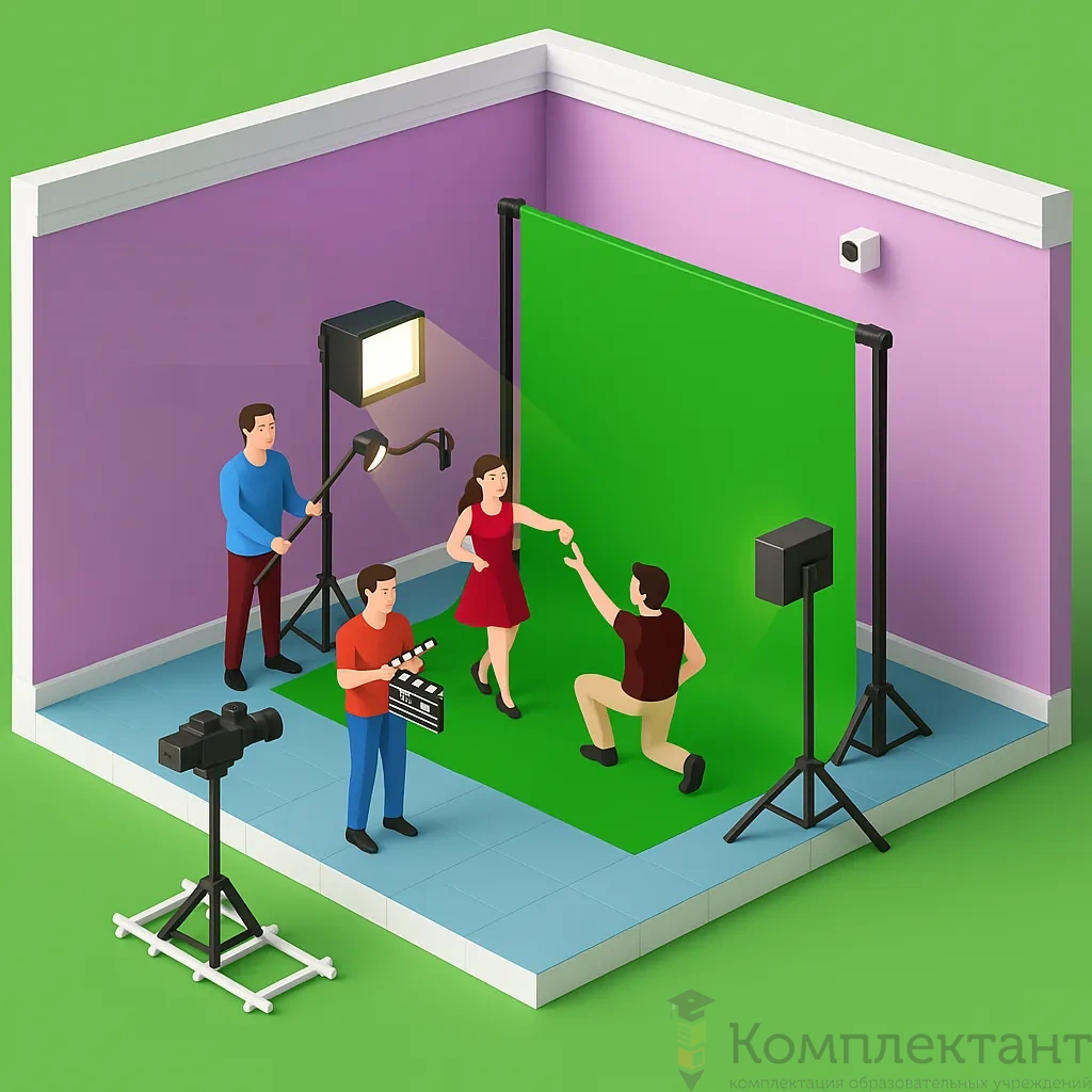 • Хромакей: переносной, зеленый, размеры 100×200 см и 300×300 см.