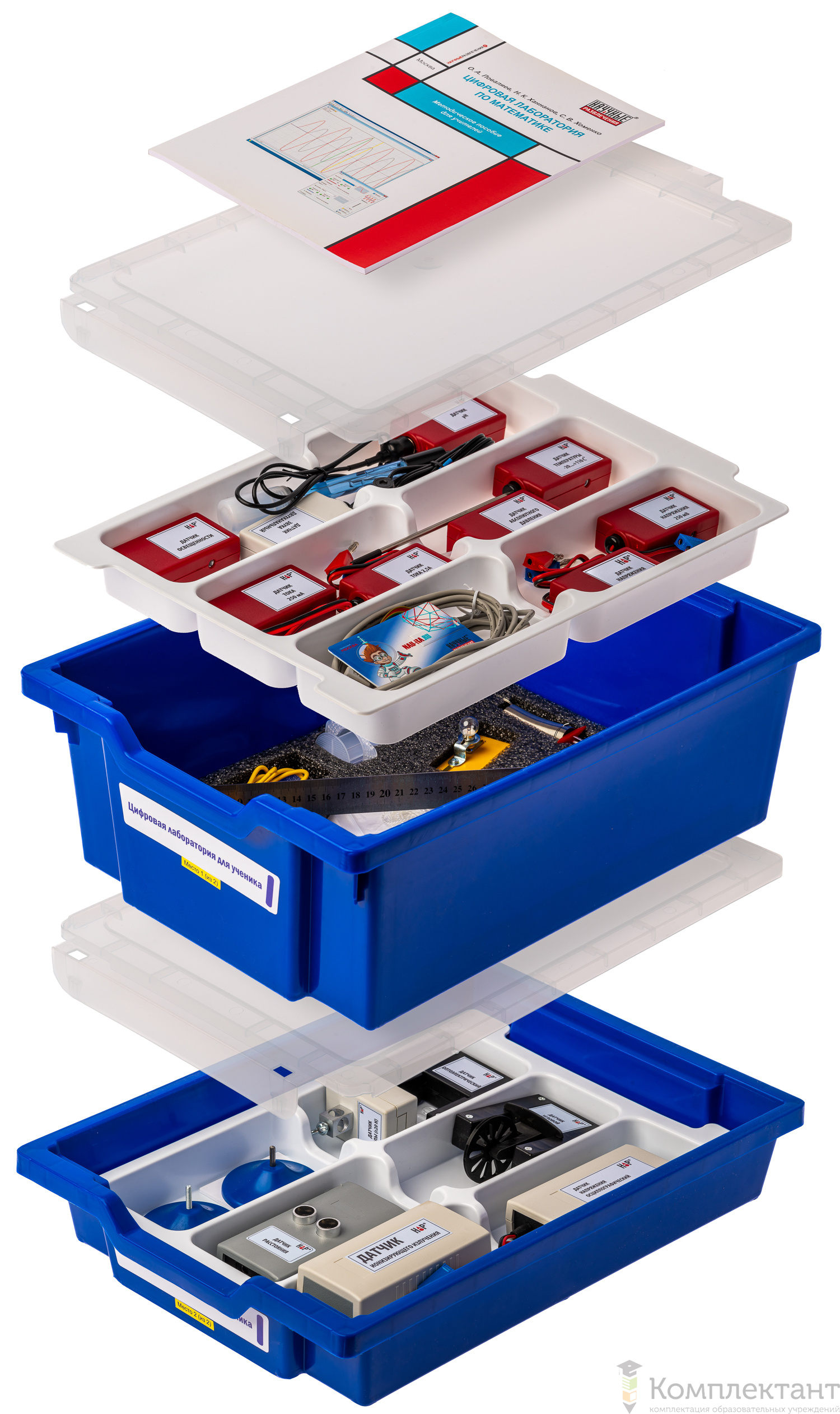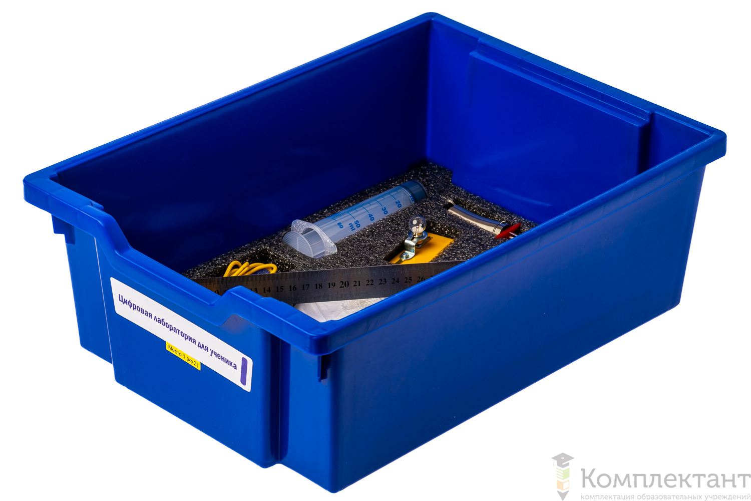Все оборудование цифровой лаборатории укомплектовано в пластиковую систему хранения, которая закрывается прозрачной пластиковой крышкой на защелках для обеспечения наблюдения за содержимым. Комплект оборудования и датчики в системе хранения располагаются на ложементах в индивидуальных ячейках.