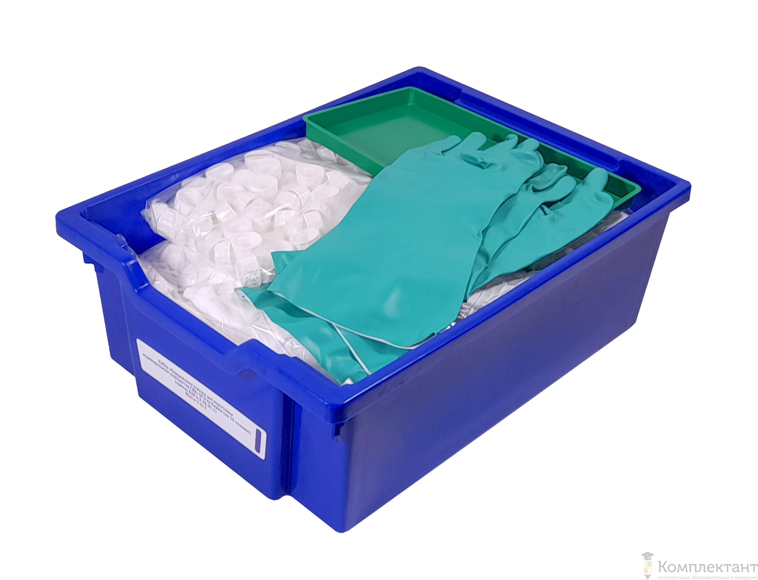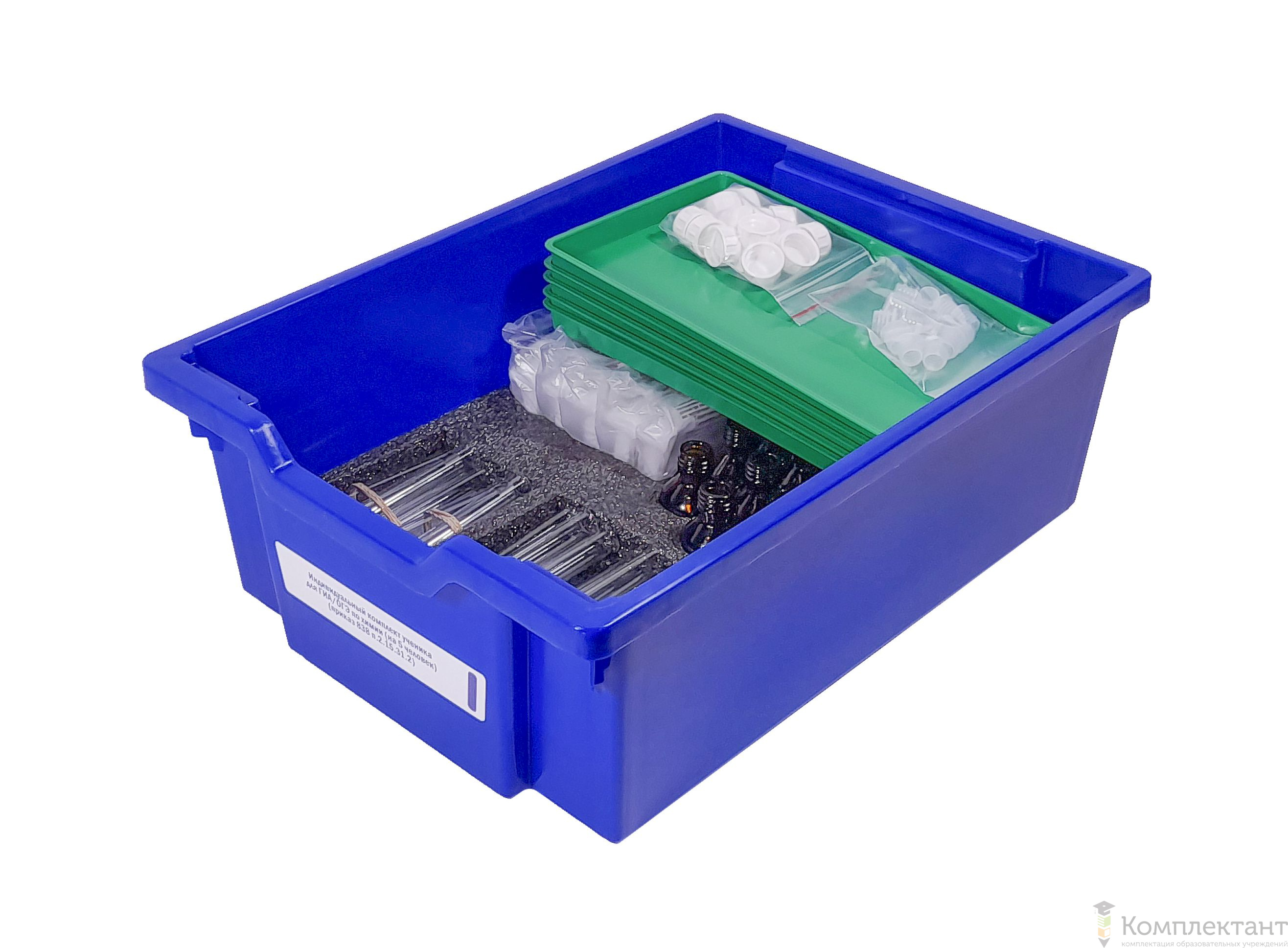 Сухие вещества в пластиковых баночках с завинчивающейся крышкой. Все флаконы и баночки с реактивами имеют наклейку с названием и формулой вещества внутри.