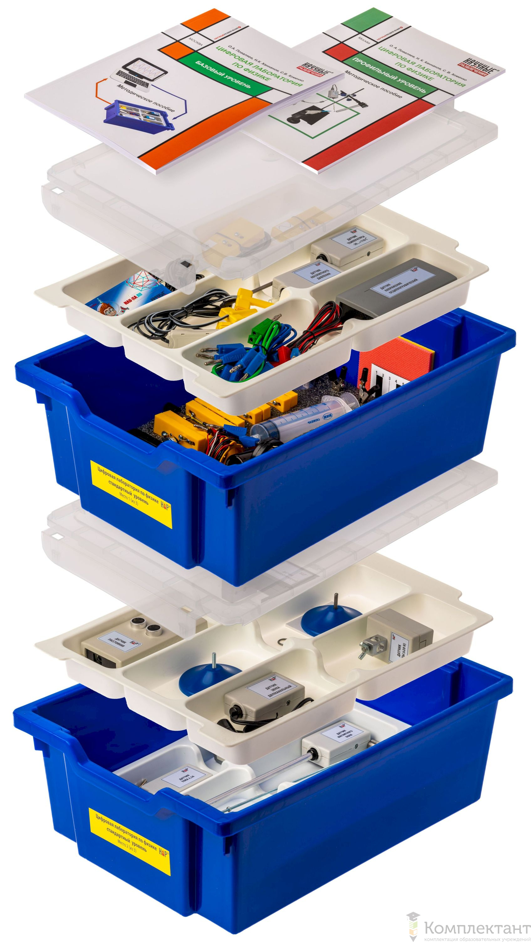 Все оборудование цифровой лаборатории (кроме скамьи лабораторной) укомплектовано в пластиковые системы хранения, которые закрываются прозрачной пластиковой крышкой на защелках для обеспечения наблюдения за содержимым. Комплект оборудования и датчики в системах хранения располагаются на ложементах в индивидуальных ячейках.